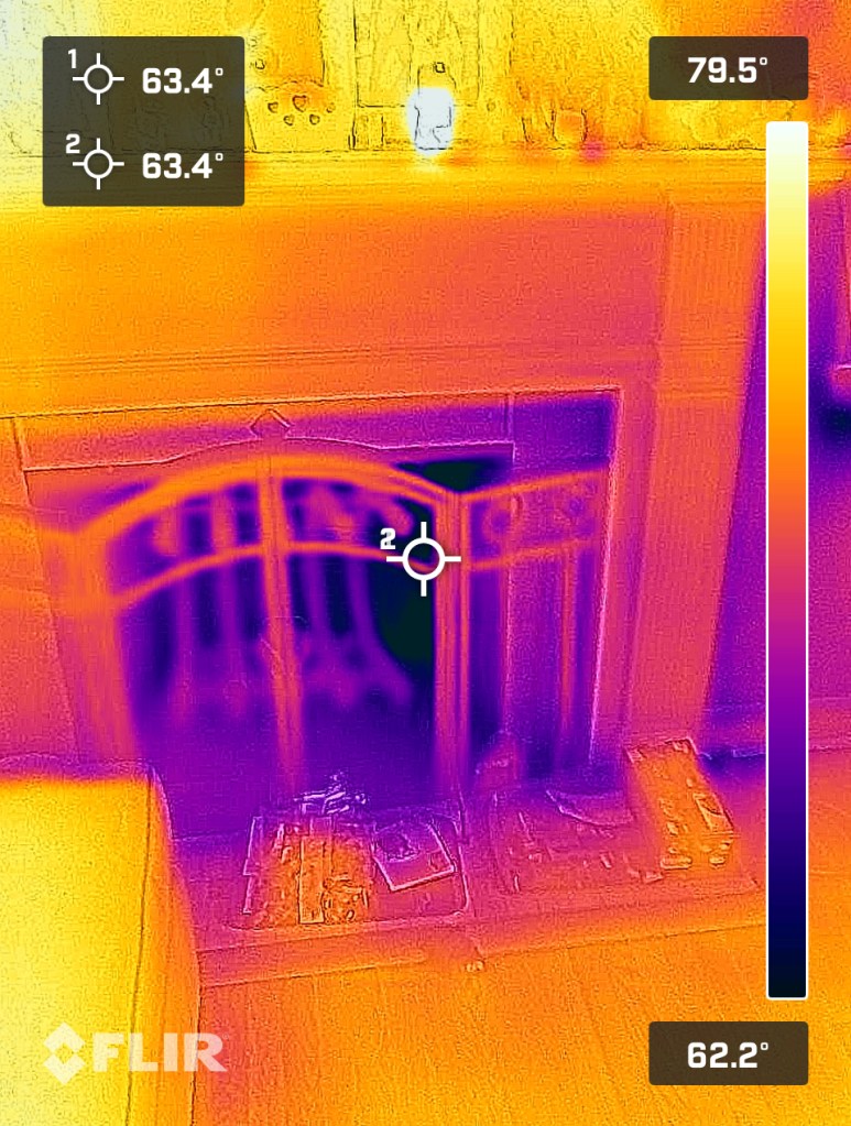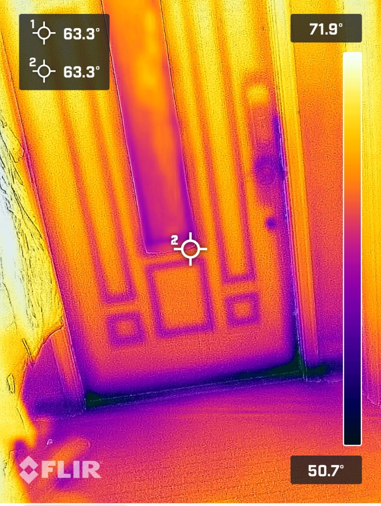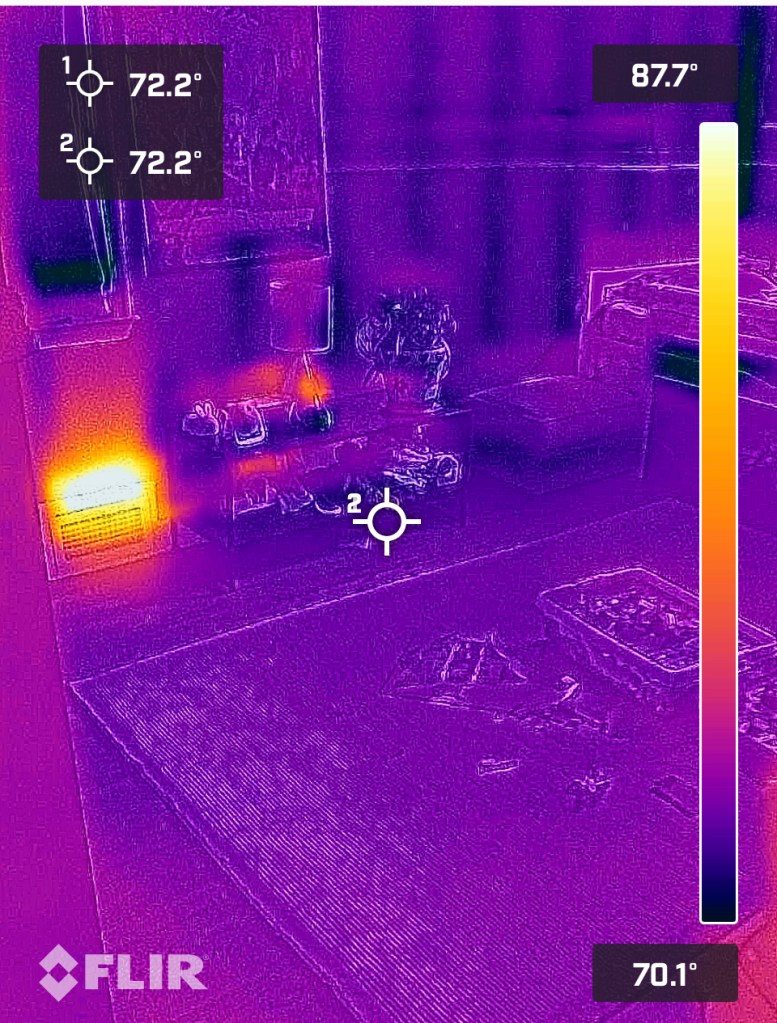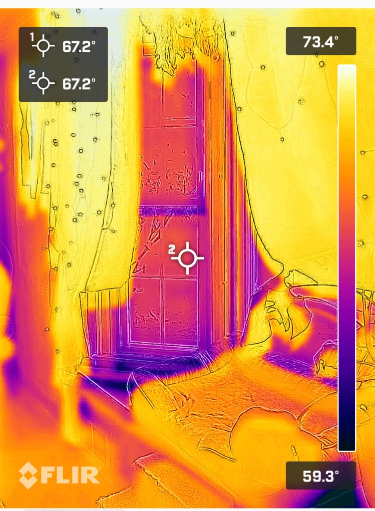 Remember, the temperature is relative. The “coldest” here is 70 degrees – the scale is different than prior photos. This room has new windows and has a heating vent so there is very little leakage.