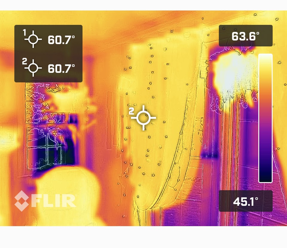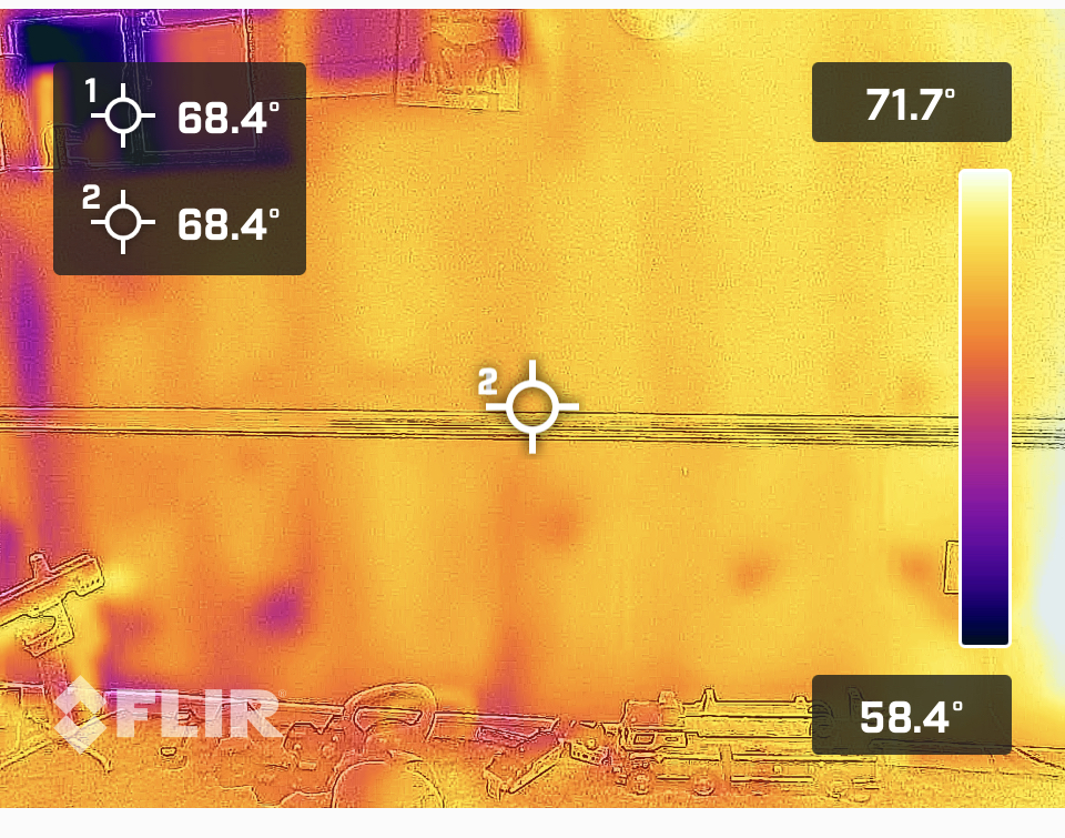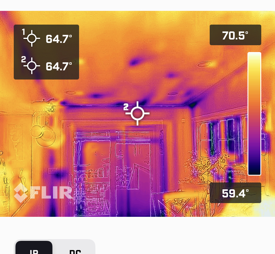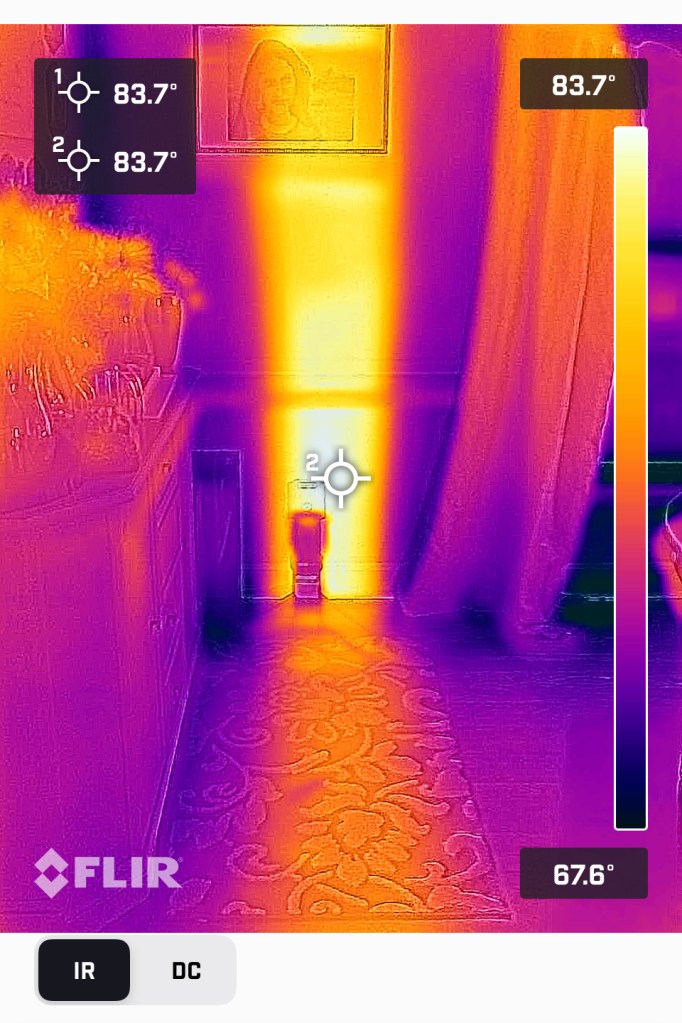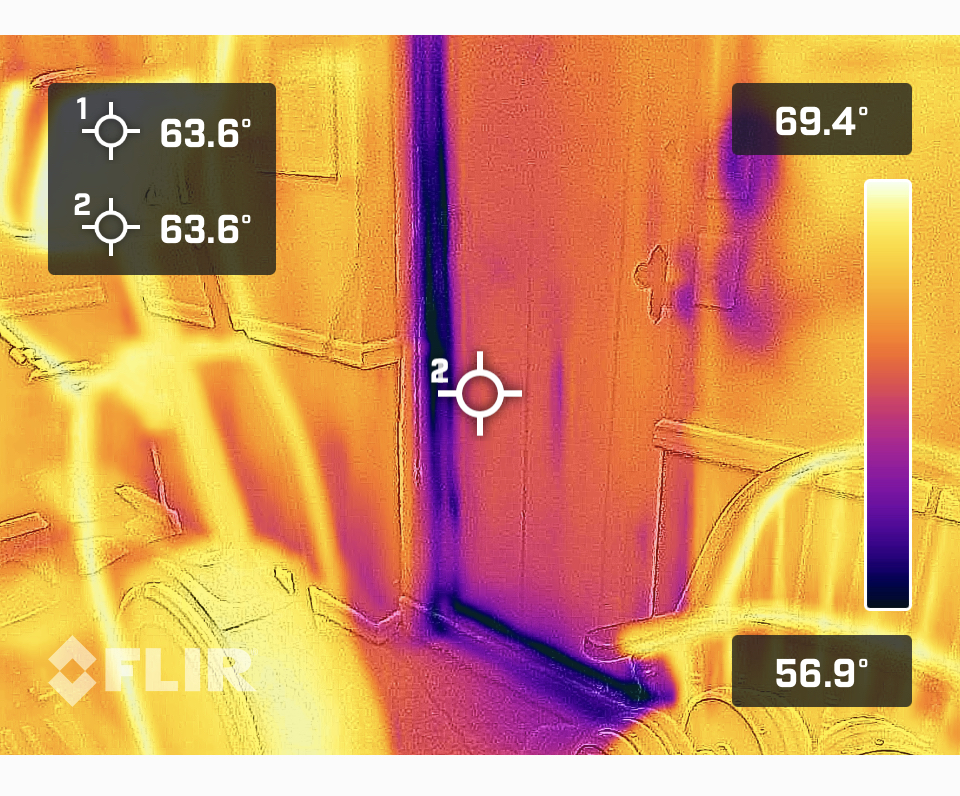 Remember, the temperature is relative. The “coldest” here is 70 degrees – the scale is different than prior photos. This room has new windows and has a heating vent so there is very little leakage.