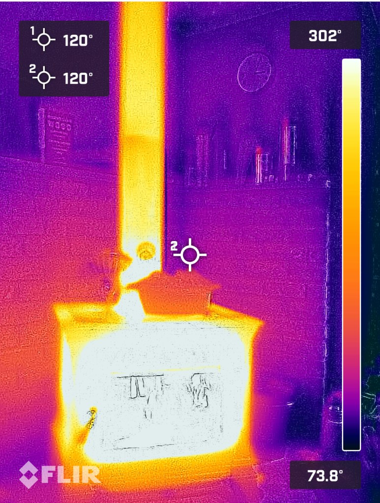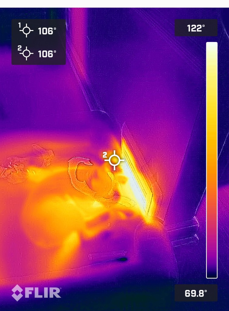 I think the limit of this camera model is around 300F, because the inside shows the same (I clicked “DC” mode which shows normal lighting). However I have another thermal sensor that doesn’t take photos, its a laser that you just point at a surface and it shows you the surface temp; that sensor shows the inside of the wood stove (the actual fire) at over 700.