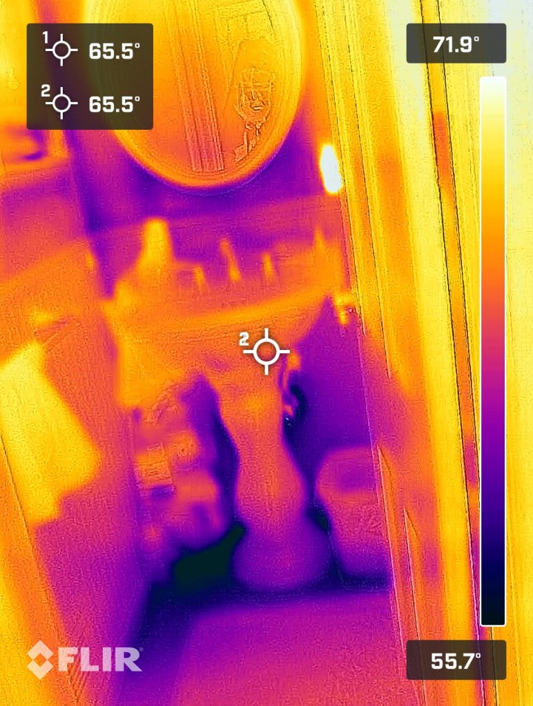 The temperatures shown here are relative; if you took these measurements on a day that is 20 degrees colder/warmer outside, the absolutes may change, but the spread is really what is important (aka the “leaks”). Most of these were taken when it was about ~50F outside.