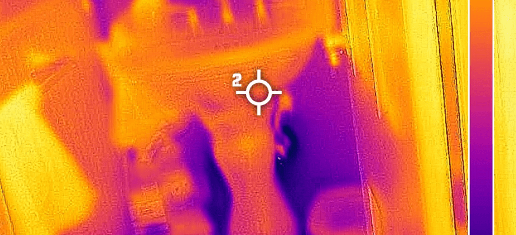 There is another odd leak too – that purple spot right just northwest of the target – which is cold air from the crawlspace underneath leaking into the kitchen.